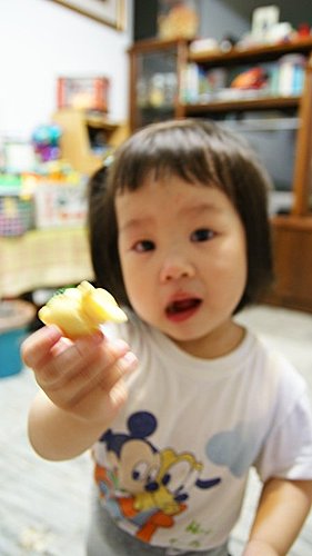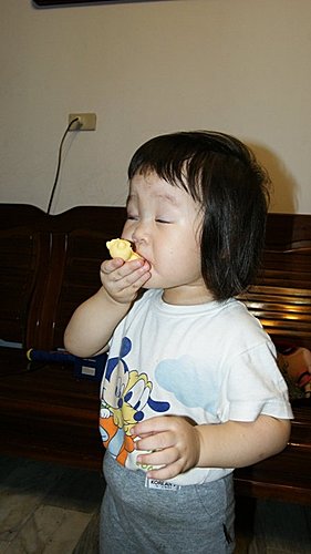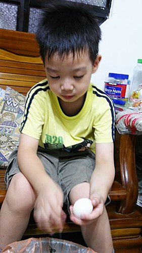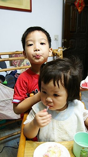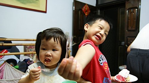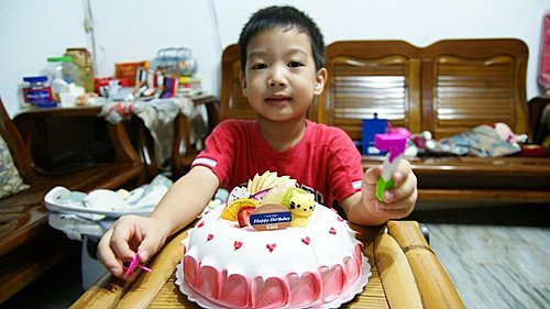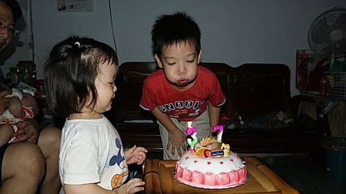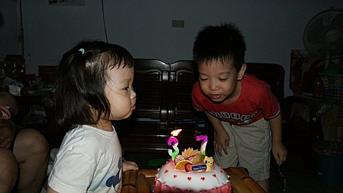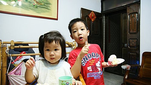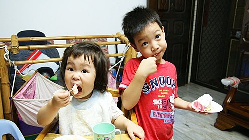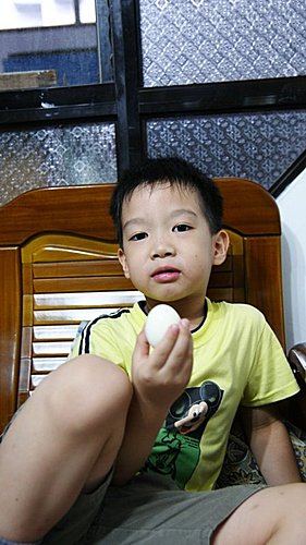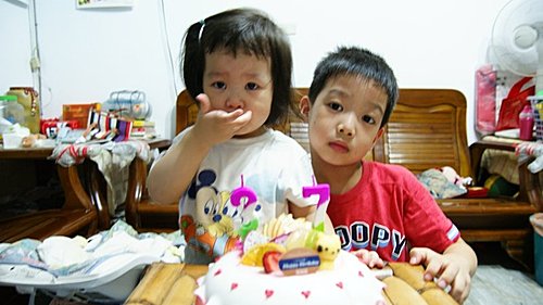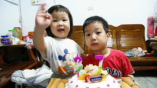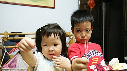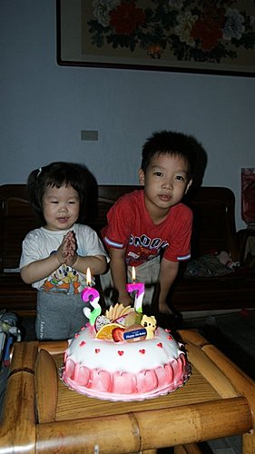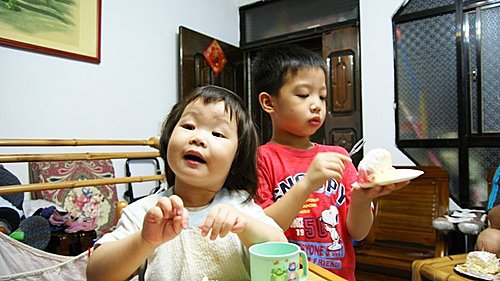 上周五是阿 Ray 跟妹的農曆生日(他們兩個農曆是同一天),這天我下班後就繞去 FM STATION 買了一個小蛋糕準備回家慶祝,回到家後,正好看到 Ray 在客廳剝著一顆顆的水煮蛋,原來是阿嬤說他們兩個兄妹過生日,所以要吃水煮蛋沾醬油膏吃,晚餐還要再吃一些麵線,只見阿妹在旁邊吃著哥哥剝給他的水煮蛋,我靠過去妹的身邊跟她說,妹,給拔拔吃一口好不好,她搖了搖頭,用手把我撥開,怎樣都不肯給拔拔吃,後來還是看到哥哥又剝好一顆,她就趕緊把手上吃剩的塞給我,然後又去搶著要拿哥哥新剝好的,這小小姑娘還是一樣這麼貪吃,還真是傷腦筋。