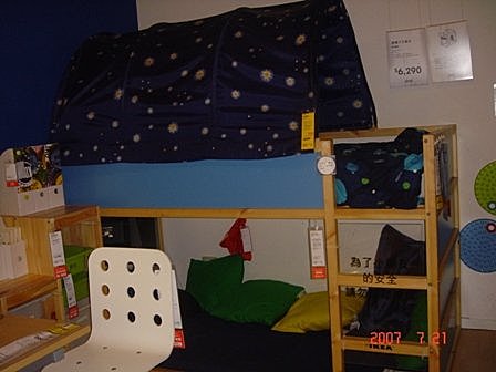 圖-在IKEA的兒童區陳列著不少不錯的設計,圖片中這一組的設計就是加了一個帳篷,讓小朋友睡覺時有滿天的星斗陪伴