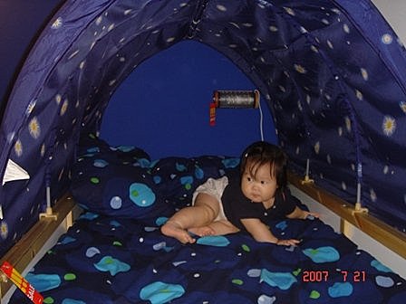圖-可能太舒服了,阿妹爬進去帳篷內後,就不大想出來了