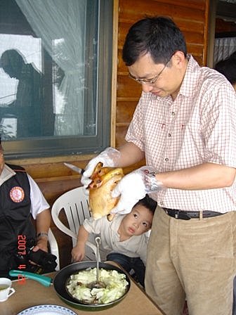 圖 - 看哪,香噴噴的雞終於烤好了,看我們家阿 Ray 坐在後面口水直流